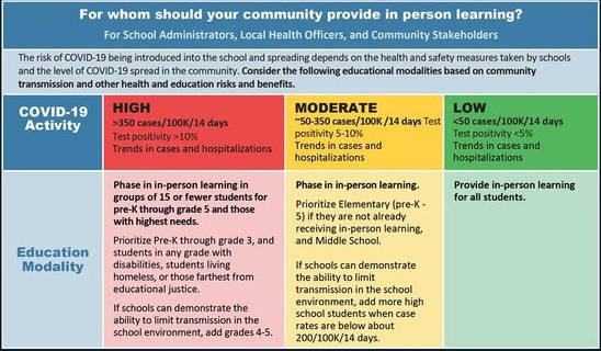 • In counties where COVID-19 cases are “high” (over 350 per 100,000 residents), it’s recommended that schools should only offer in-person instruction for elementary and high-need students in small groups of 15 students or fewer.