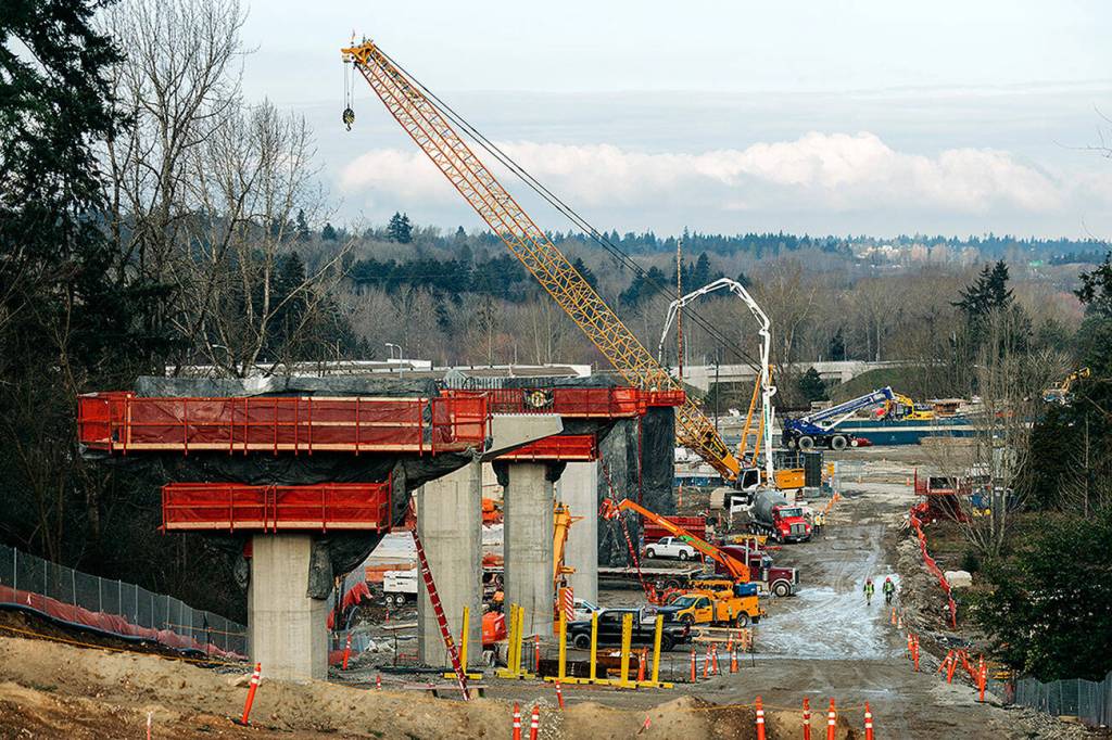 A shot looking north of the columns being constructed in SeaTac February 10, 2021. Part of the Federal Way Link Extension. Photo courtesy of Sound Transit
