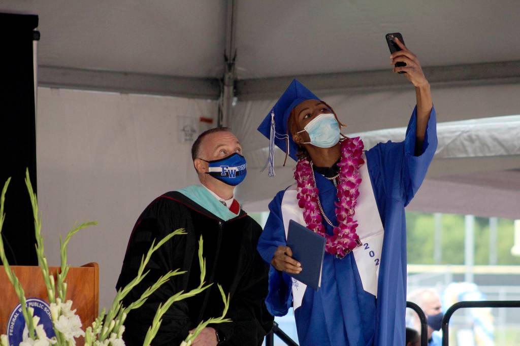 Tajhgee Haskins, a Federal Way graduate, said he and his longtime best friend Drew Klein decided to snap a quick selfie with principal Matt Oberst after picking up their diplomas on stage.