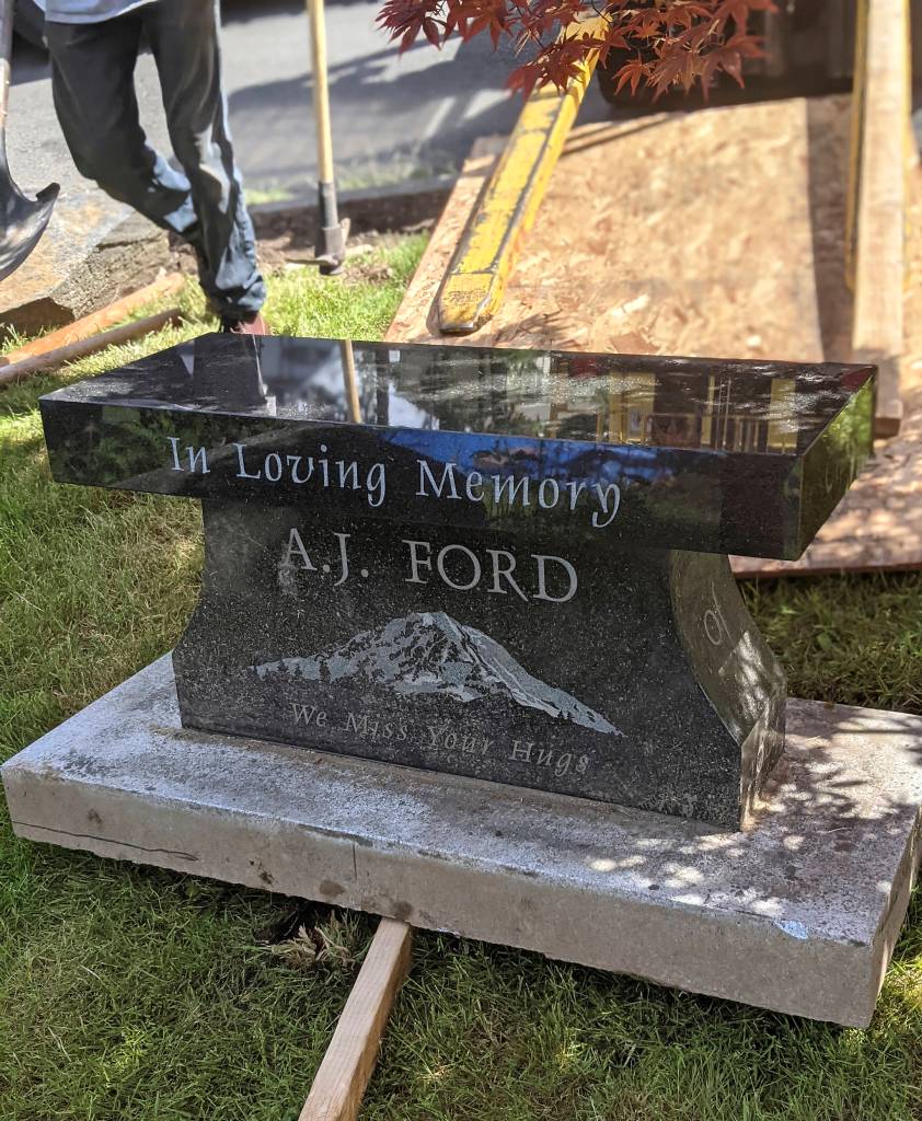 To commemorate his life, the family had a memorial bench built to be placed at Thomas Jefferson. The bench is made with granite from Africa and, under AJ’s name and an engraving of Mount Rainier, reads “we miss your hugs.”