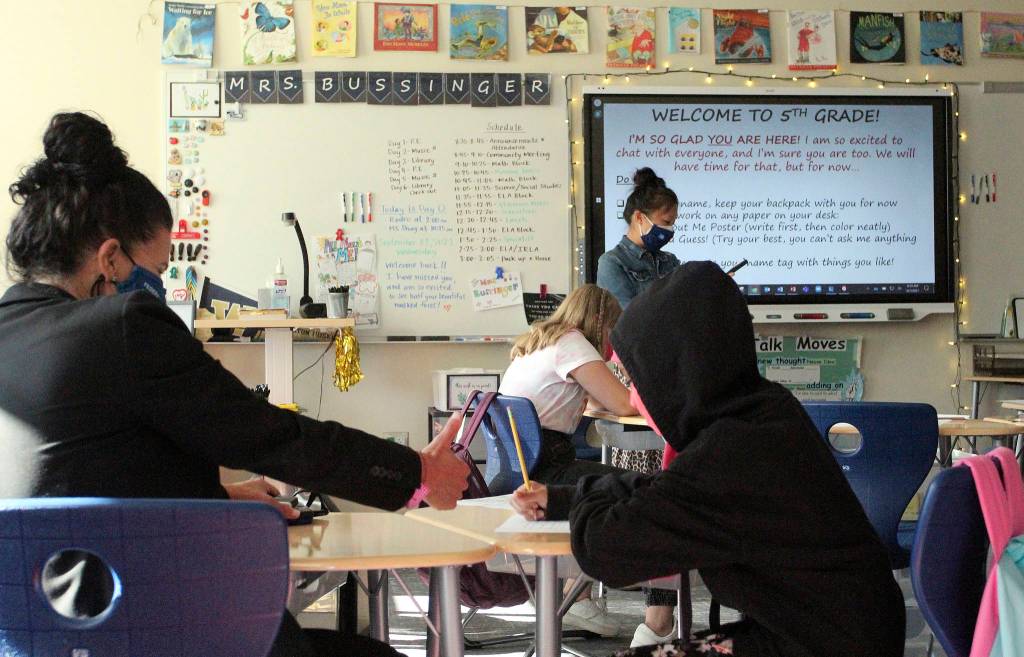 As the fully in-person year begins, students are required to wear masks throughout the day except when playing outside at recess or eating at lunch – seated at least three feet away from each other.