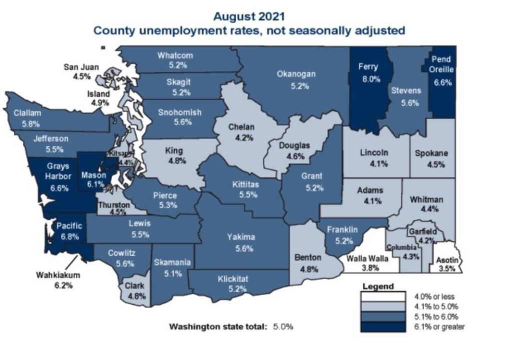 As of August 2021, King County’s unemployment rate is 4.8% — lower than the state average of 5% — several factors contribute to the lower rate, said Anneliese Vance-Sherman, ESD regional economist.