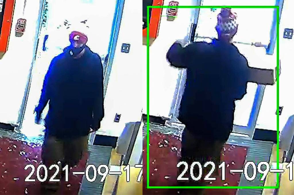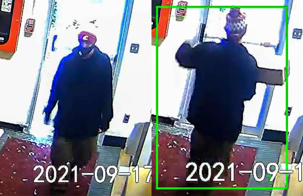The images, enhanced from the video surveillance footage, show a man wearing a black sweatshirt, dark pants and a dark face mask along with a Washington State University Cougars beanie.