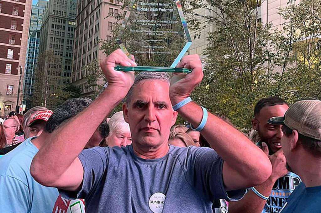 On Nov. 1, Protzman posted a photo of himself to his Telegram channel holding a trophy inscribed with: “The Gematria General: God communicates in numbers and Trump does too.” He also uses his social media platform to spread antisemitic content, according to Vice.