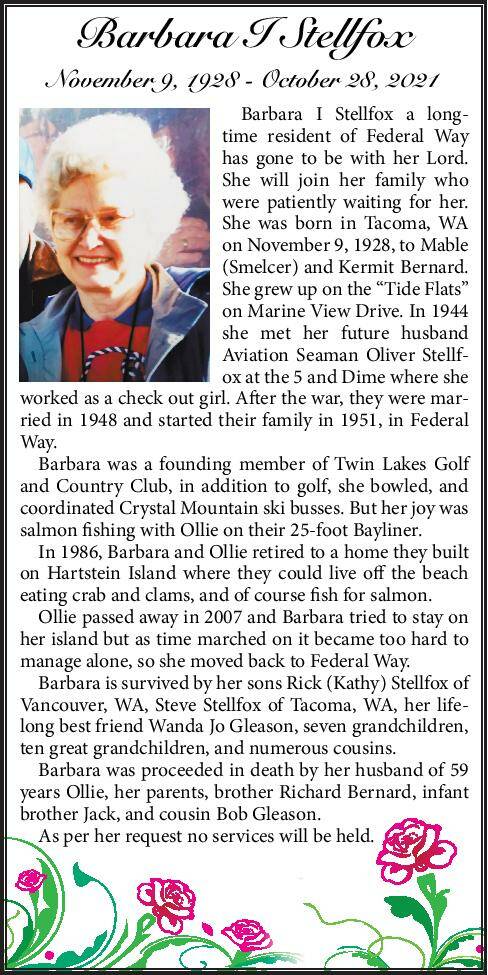 Barbara I. Stellfox, a longtime resident of Federal Way, has gone to be with her Lord. She will join her family who were patiently waiting for her. She was born in Tacoma, WA on November 9, 1928, to Mable (Smelcer) and Kermit Bernard. She grew up on the “Tide Flats” on Marine View Drive. In 1944 she met her future husband Aviation Seaman Oliver Stellfox at the 5 and Dime where she worked as a check out girl. After the war, they were married in 1948 and started their family in 1951, in Federal Way.