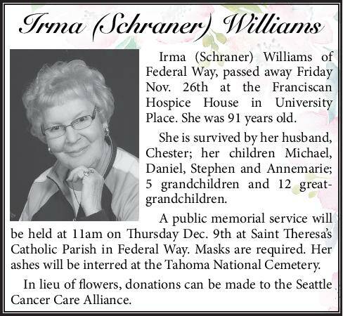 Irma (Schraner) Williams of Federal Way, passed away Friday Nov. 26th at the Franciscan Hospice House in University Place. She was 91 years old.