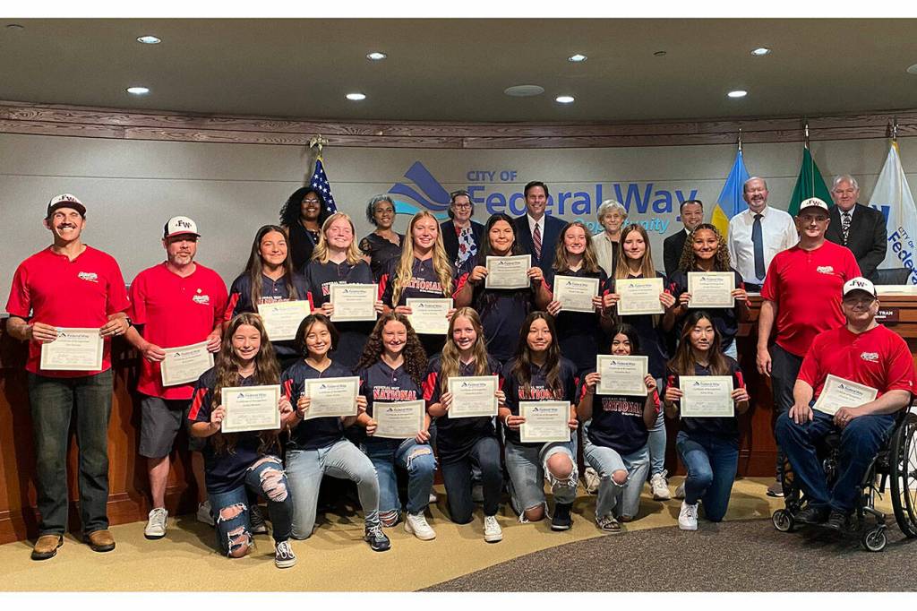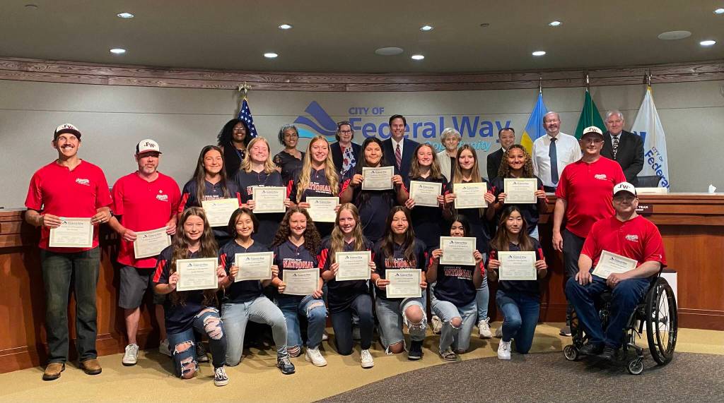 The Federal Way National juniors softball state champions were honored at the July 19 Federal Way City Council meeting. Olivia Sullivan/the Mirror