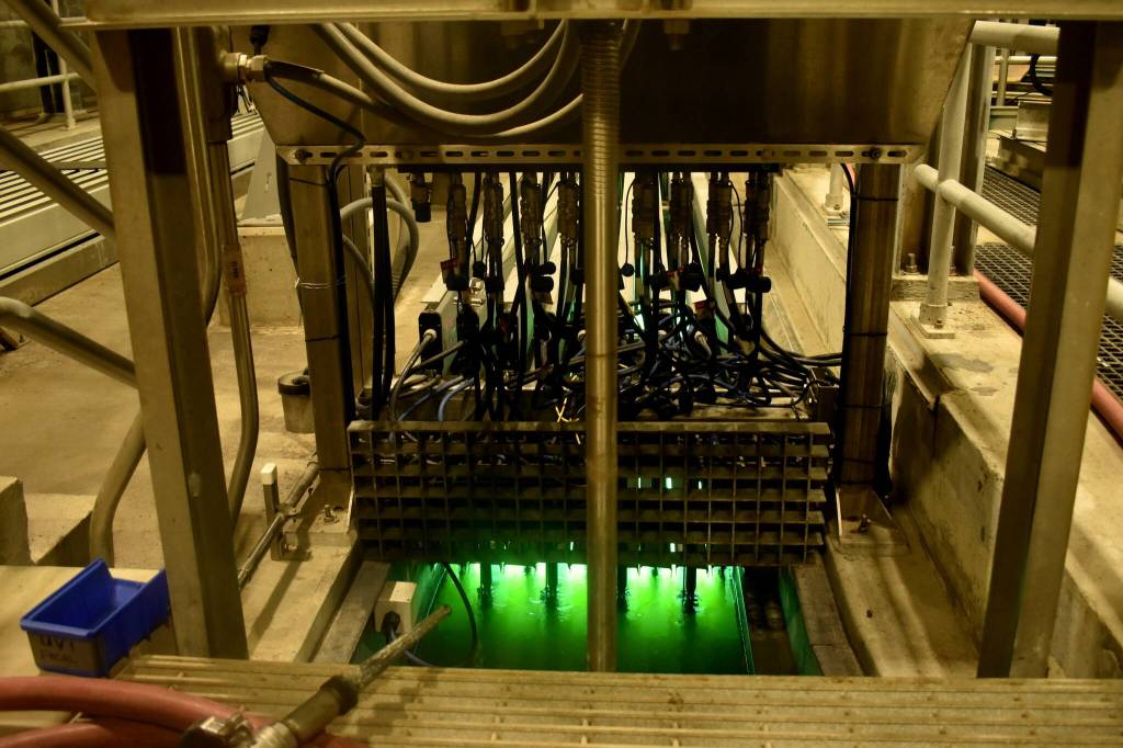 Meanwhile, the waste water streams through two more secondary clarifiers and then heads to filtering and disinfection. The plant bathes the water in green ultraviolet light, which kills pathogens by breaking apart their DNA. When too much water gums up the system from heavy rain, it pools in this area near the very end of the process.