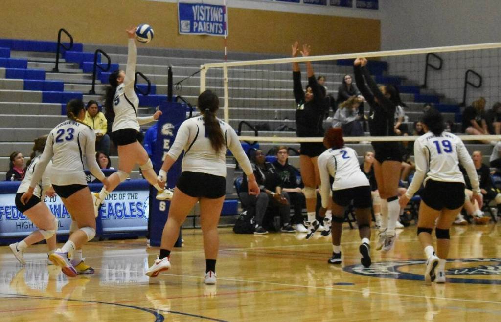 The Kentwood Conquerors took down the Federal Way High School Eagles on Oct. 19 inside the Eagles’ gym, where the volleyball match went to a fourth set — the second time this season that any of their matches had gone more than three sets.