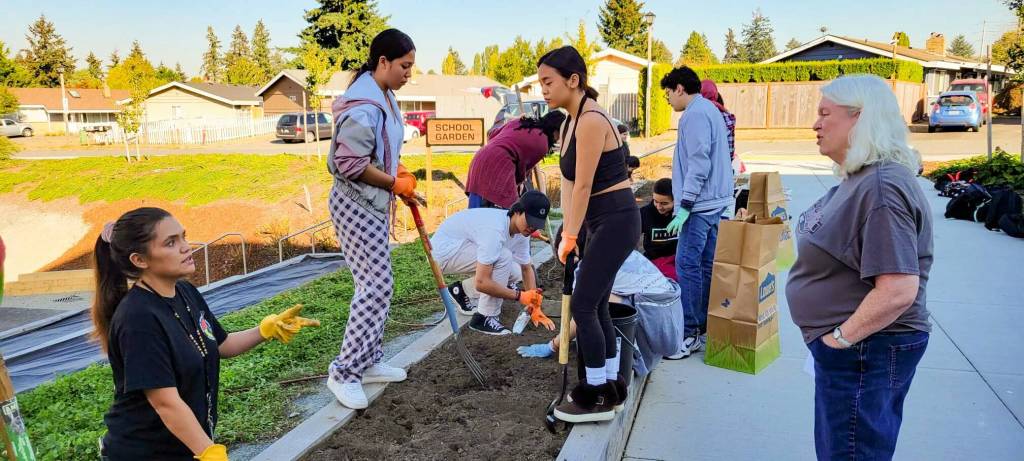 Scholars in the Native American Coalition Club (NACC) work in a garden at Thomas Jefferson High School, learning about Indigenous food sources, plants and more.