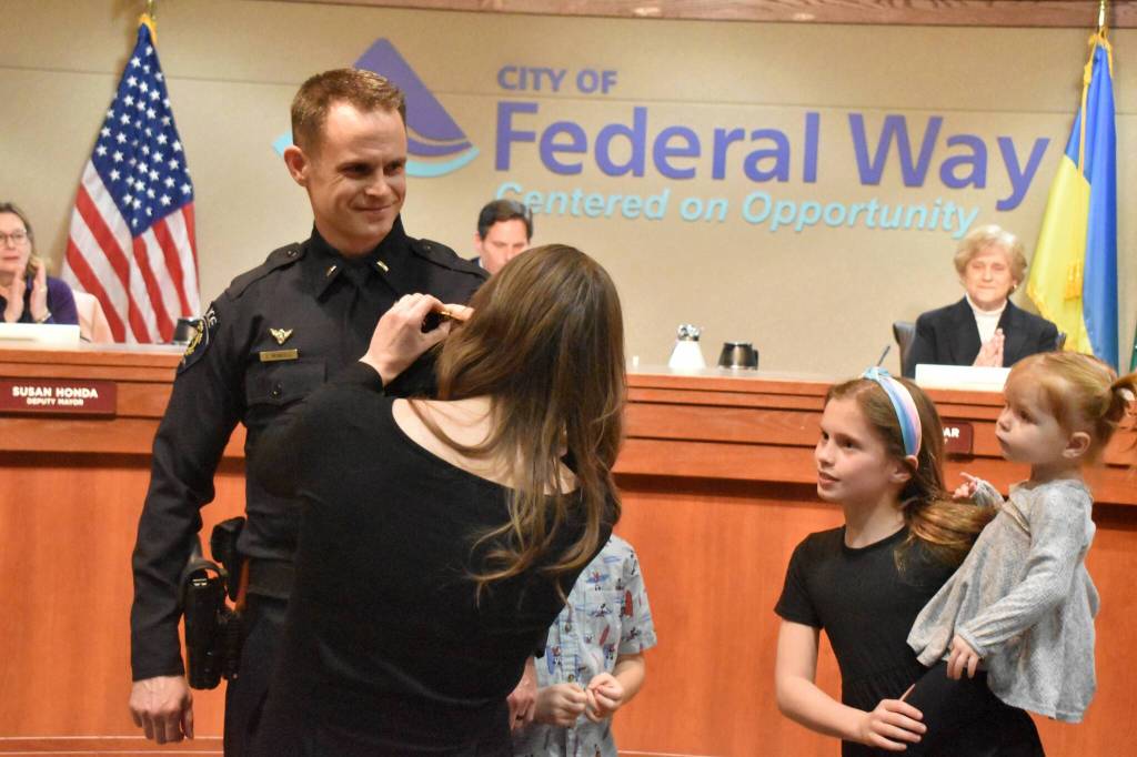 The council kicked off the packed, three-hour meeting Tuesday evening with a promotional swearing in of Federal Way Police Lieutenant Jeff Mundell, who was previously a corporal with the department. Mundell began his career at FWPD in 2007. Prior to that, he served six years on active duty in the U.S. Air Force, and he recently retired from 20 years serving in the Washington Air National Guard. He was promoted to corporal at FWPD in 2017. Chief Hwang lauded Mundell’s service history and broad experience across the police department. “Called to service, Jeff has served our country, state and community in some way since he was 21 years old,” Hwang said. “We are fortunate to have Jeff as a leader for our agency.”