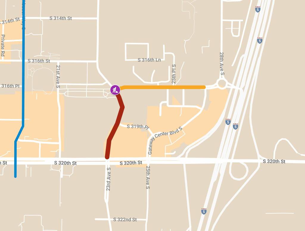 This map shows some of the changes coming to the transit center area. Part of 23rd Avenue S (highlighted in red) will become northbound only. South 317th Street (orange) will have its center turn lane eliminated. Pete von Reichbauer Way South (blue) will be restriped to expand road capacity. And a new roundabout (purple) will be installed at the 23rd Avenue South / S 317th Street intersection by the end of the year. Image visualized using Google My Maps, using information from Sound Transit. Alex Bruell / The Mirror.