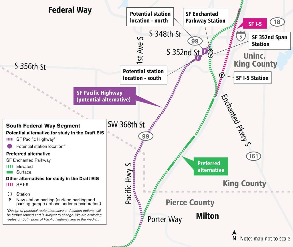 What has changed is part of the line south of 352nd Street. The agency no longer has a preferred choice for how it proceeds south from there and instead has at least a few options to consider, including: