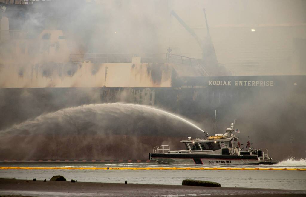 The fishing vessel, called Kodiak Enterprise, caught fire early in the morning on April 8 while moored in the Hylebos Waterway near the Port of Tacoma. It was estimated to have about 55,000 gallons of diesel and 19,000 pounds of freon on board. The freon tanks are designed to release pressure if the heat from the fire gets too intense.