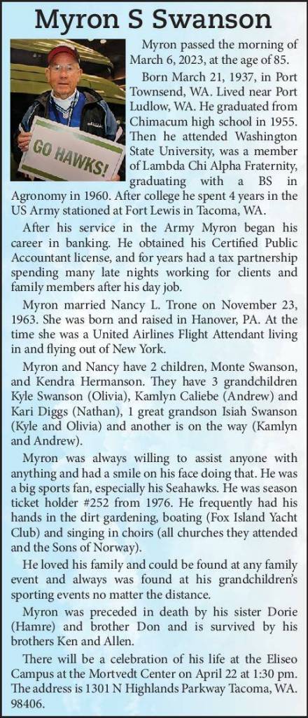 Myron was always willing to assist anyone with anything and had a smile on his face doing that. He was a big sports fan, especially his Seahawks. He was season ticket holder #252 from 1976. He frequently had his hands in the dirt gardening, boating (Fox Island Yacht Club) and singing in choirs (all churches they attended and the Sons of Norway).