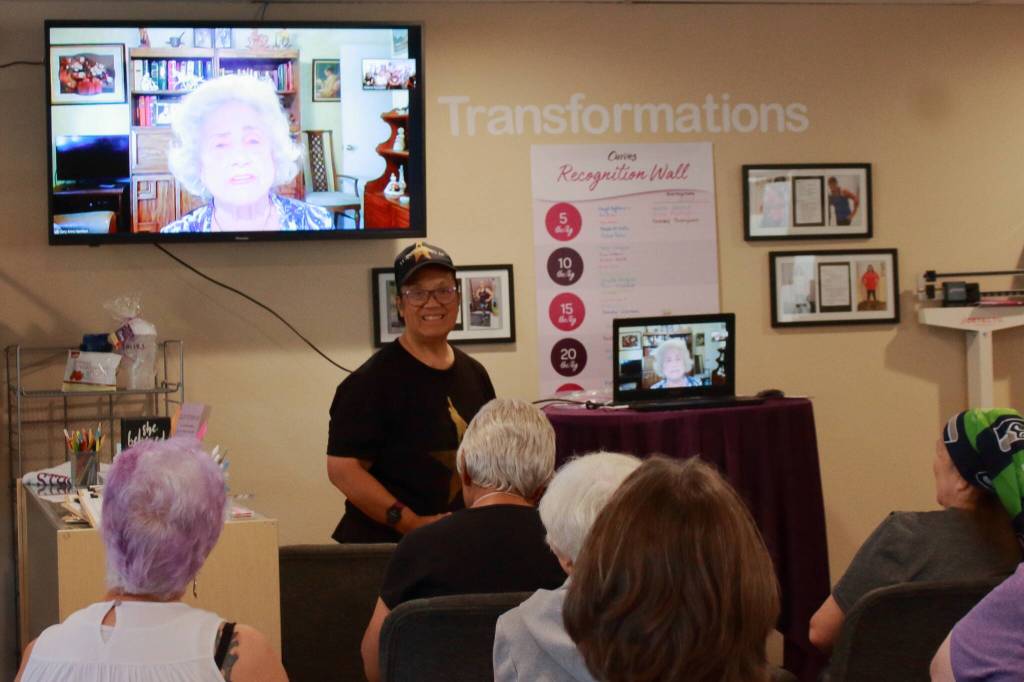 Helena Reynolds introduces Mary Anne Hamilton via zoom as she shares some of her life stories through an event at Curves in Federal Way. Mary Anne Hamilton is the great-great granddaughter-in-Law of the U.S Founding Father Alexander Hamilton and has recently published a book about her life called “Destined to be a Hamilton.” Photo by Keelin Everly-Lang / The Mirror.