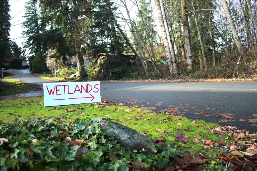 In a quiet corner of Federal Way, a small handwritten sign states simply “wetlands.” An arrow points across a street toward tall trees and low underbrush.