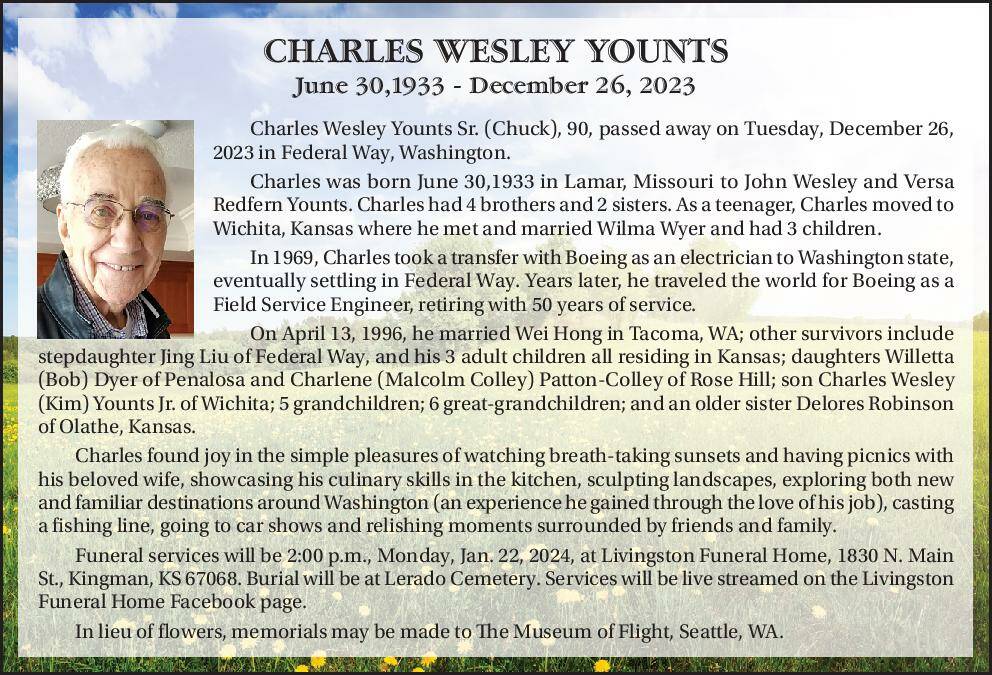 On April 13, 1996, he married Wei Hong in Tacoma, WA; other survivors include stepdaughter Jing Liu of Federal Way, and his 3 adult children all residing in Kansas; daughters Willetta (Bob) Dyer of Penalosa and Charlene (Malcolm Colley) Patton-Colley of Rose Hill; son Charles Wesley (Kim) Younts Jr. of Wichita; 5 grandchildren; 6 great-grandchildren; and an older sister Delores Robinson of Olathe, Kansas.