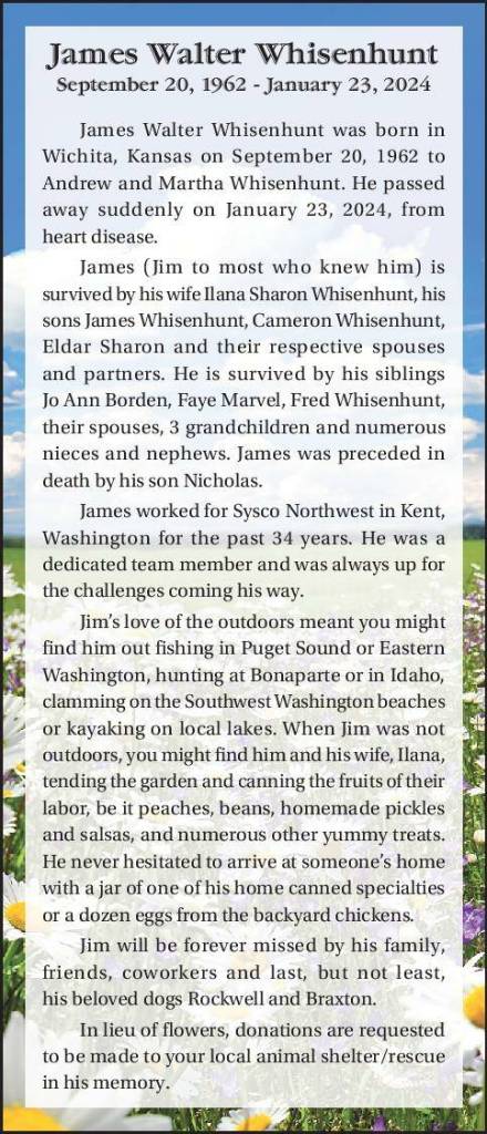 James Walter Whisenhunt was born in Wichita, Kansas on September 20, 1962 to Andrew and Martha Whisenhunt. He passed away suddenly on January 23, 2024, from heart disease.