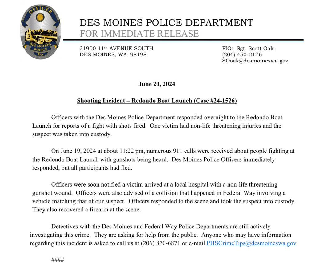 According to the Des Moines Police Department, officers responded to the Redondo boat launch late Wednesday night, June 19, following reports of a fight with shots fired.