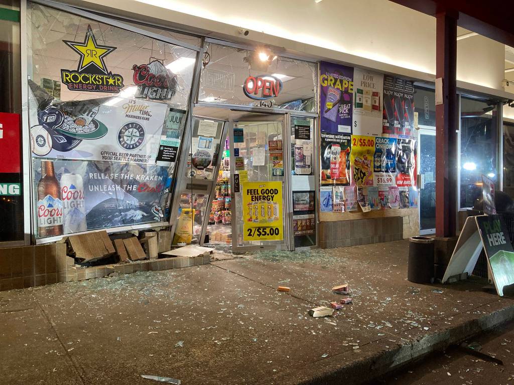 At about 4 a.m. April 18 at Beverage and Smoke Shop in the 2100 block of SW 336th Street in Federal Way, police believe juveniles in a stolen Kia backed into the business at a high rate of speed and shattered the glass looking into the storefront. The impact caused thousands of dollars worth of damage and shifted the entire front counter.