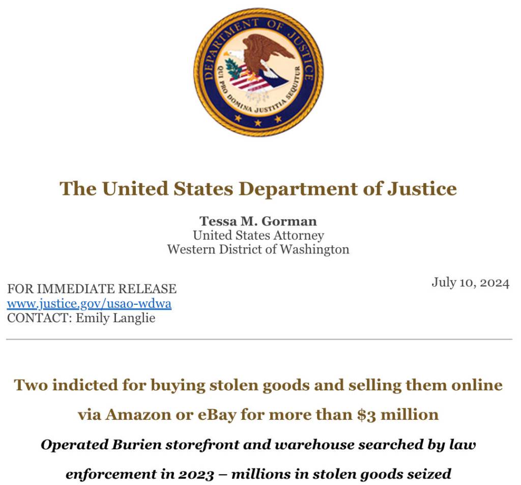 “The purchase and trafficking of these stolen goods fuels the organized retail theft that has so damaged our local retailers,” said U.S. Attorney Tessa M. Gorman. “If the ‘boosters,’ as they are called, had no market for these stolen goods, they would stop their rampant theft from our retailers.”