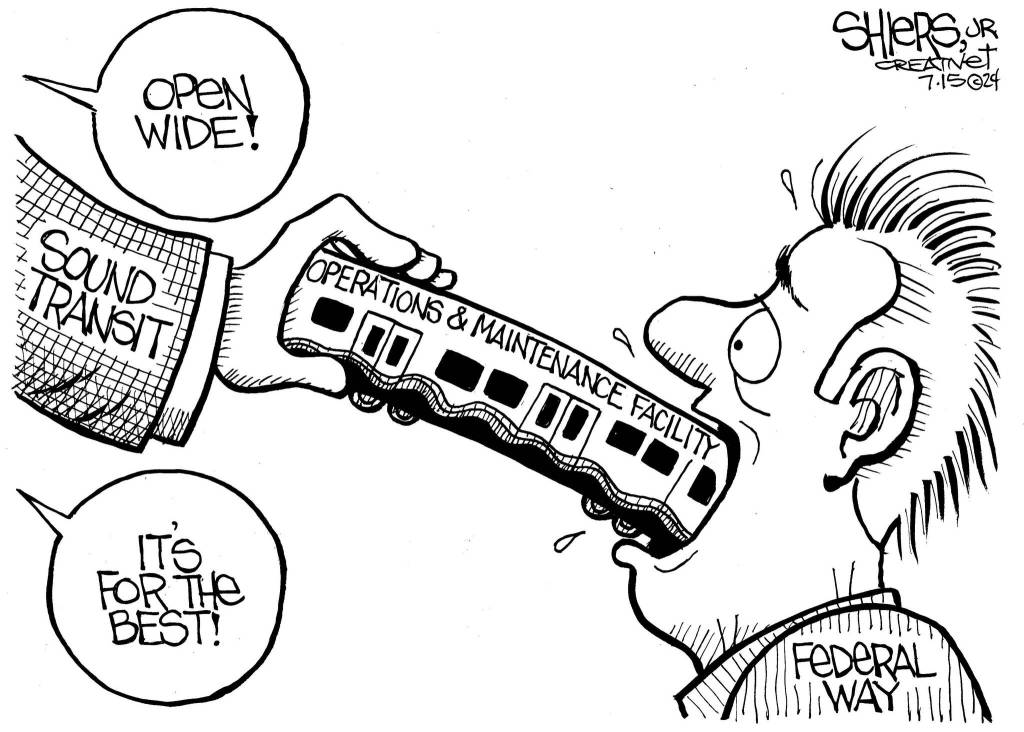 This cartoon by Frank Shiers is in response to Sound Transit’s future operations and maintenance facility in Federal Way. The South 336th Street location will displace the Christian Faith Center as well as residents and businesses.