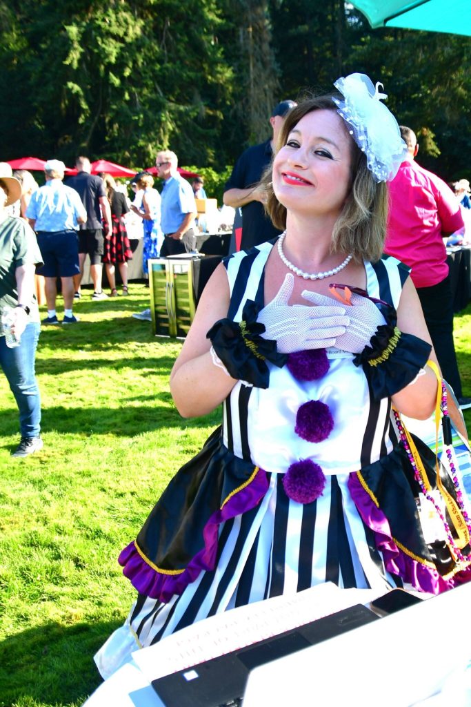 Guests not only dressed up in their tea party best - some emulated the Mad Hatter to get into the fun, like this guest who is showing off the prize packages for the auction. Photo by Bruce Honda.
