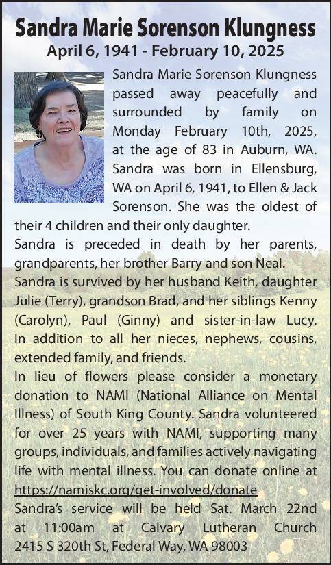 Sandra Marie Sorenson Klungness passed away peacefully and surrounded by family on Monday February 10th, 2025, at the age of 83 in Auburn, WA. Sandra was born in Ellensburg, WA on April 6, 1941, to Ellen & Jack Sorenson. She was the oldest of their 4 children and their only daughter.