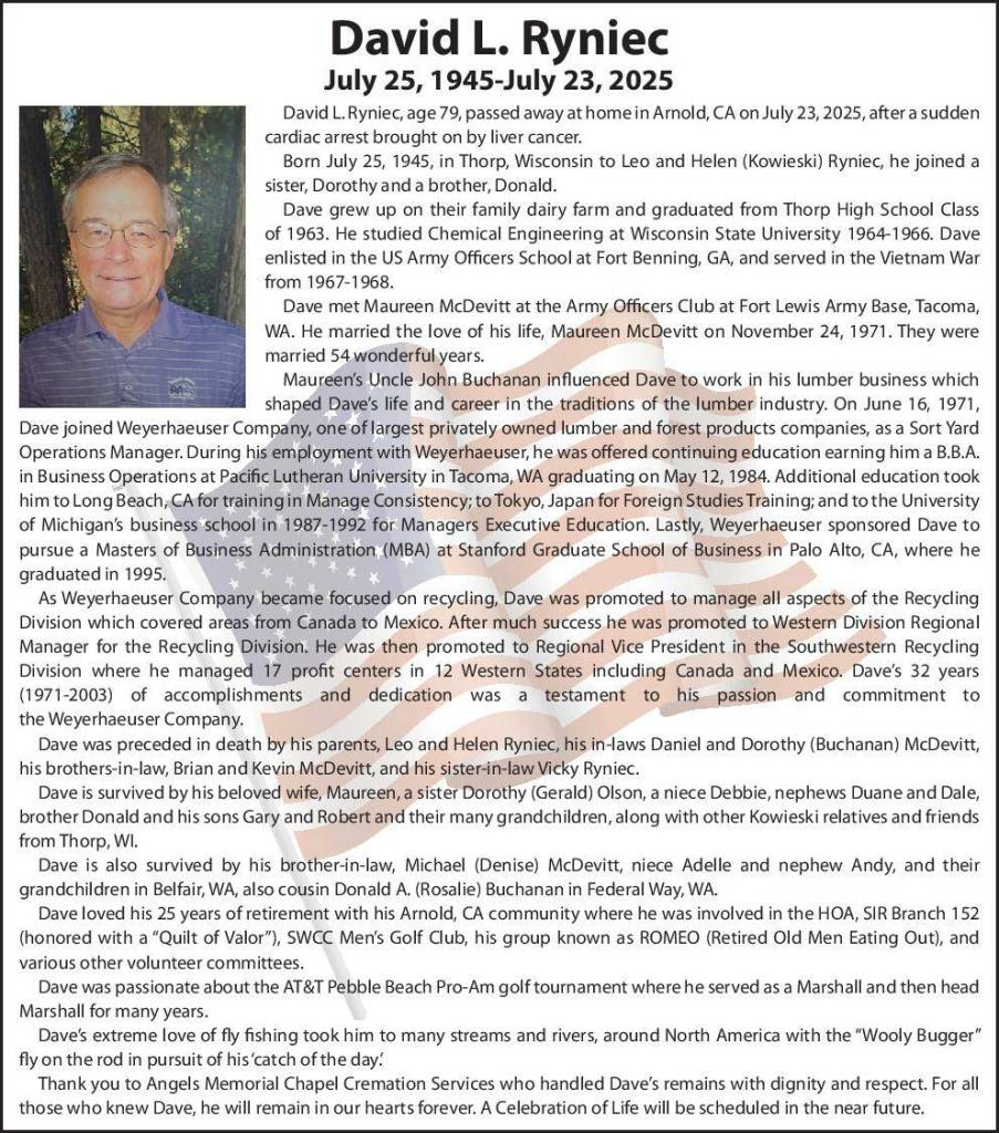 David L. Ryniec, age 79, passed away at home in Arnold, CA on July 23, 2025, after a sudden cardiac arrest brought on by liver cancer.