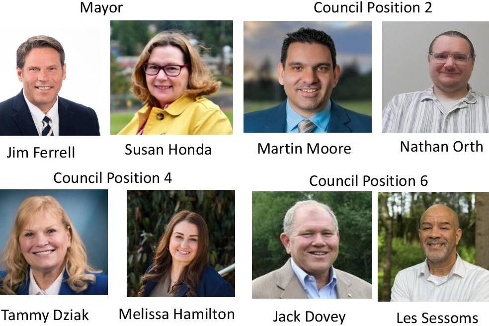 The candidates for mayor are Jim Ferrell and Susan Honda. Candidates for city council position 2 are Martin Moore and Nathan Orth. Candidates for council position 4 are Tammy Dziak and Melissa Hamilton. Candidates for council position 6 are Jack Dovey and Les Sessoms.
