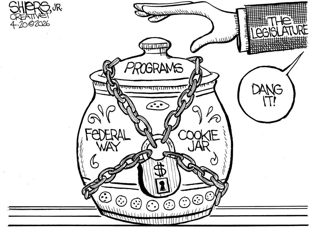 Cartoon by Frank Shiers references the story “Legislative wins for Federal Way include keeping money.”