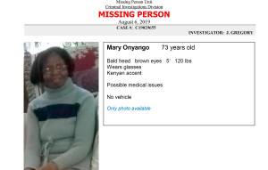 Mary Onyango, 73, went missing from her sister’s Shoreline Home on Aug. 2.