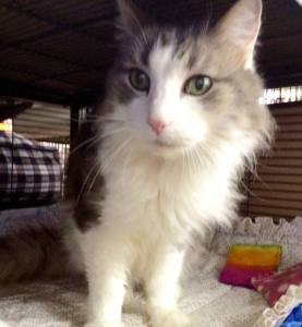 Mio is a white and gray fluffy male cat rescued from a shelter where his owner left him.