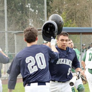 Beamer seniors Taylor Davis (left) and Chaz McKenzie (right) touch helmets in celebration after McKenzie crosses home plate during the seven-run second inning of the Titans 14-4 win over Auburn High School on March 13. McKenzie was 1-2 on the day with a run