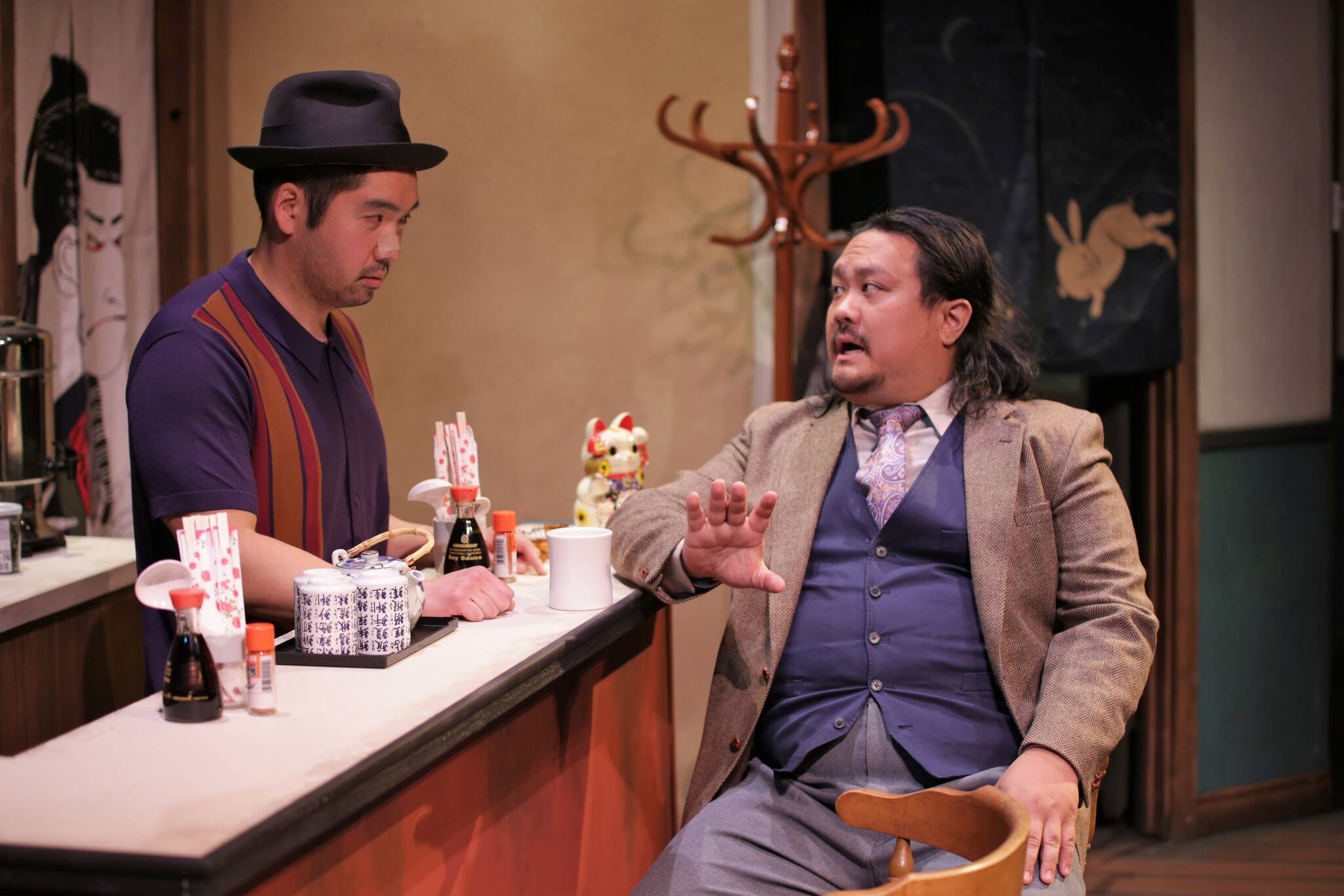 The sepia-toned set and 1970s costume immediately transports the audience into a rare noir world. Tim Takechi has impeccable timing as the dry, hardboiled detective, Sam Shikaze. Anamaria Guerzon is convincing as the persistent and pesky news reporter, Nancy Wing. Van Lang Pham, who plays Chuck Chan, has great comedic timing as does Travis Martinez, who plays Goldberg. Minki Bai as Capt. Kadota, Graham Arthur Blair as Sgt. Mackenzie, and Daniel J. Lacker as Superintendent Jameson, all deliver powerful as well as comical performances. Aya Hashiguchi Clark is so believable as the sweet restaurant owner, Rosie — it’s hard to imagine her as anyone else.