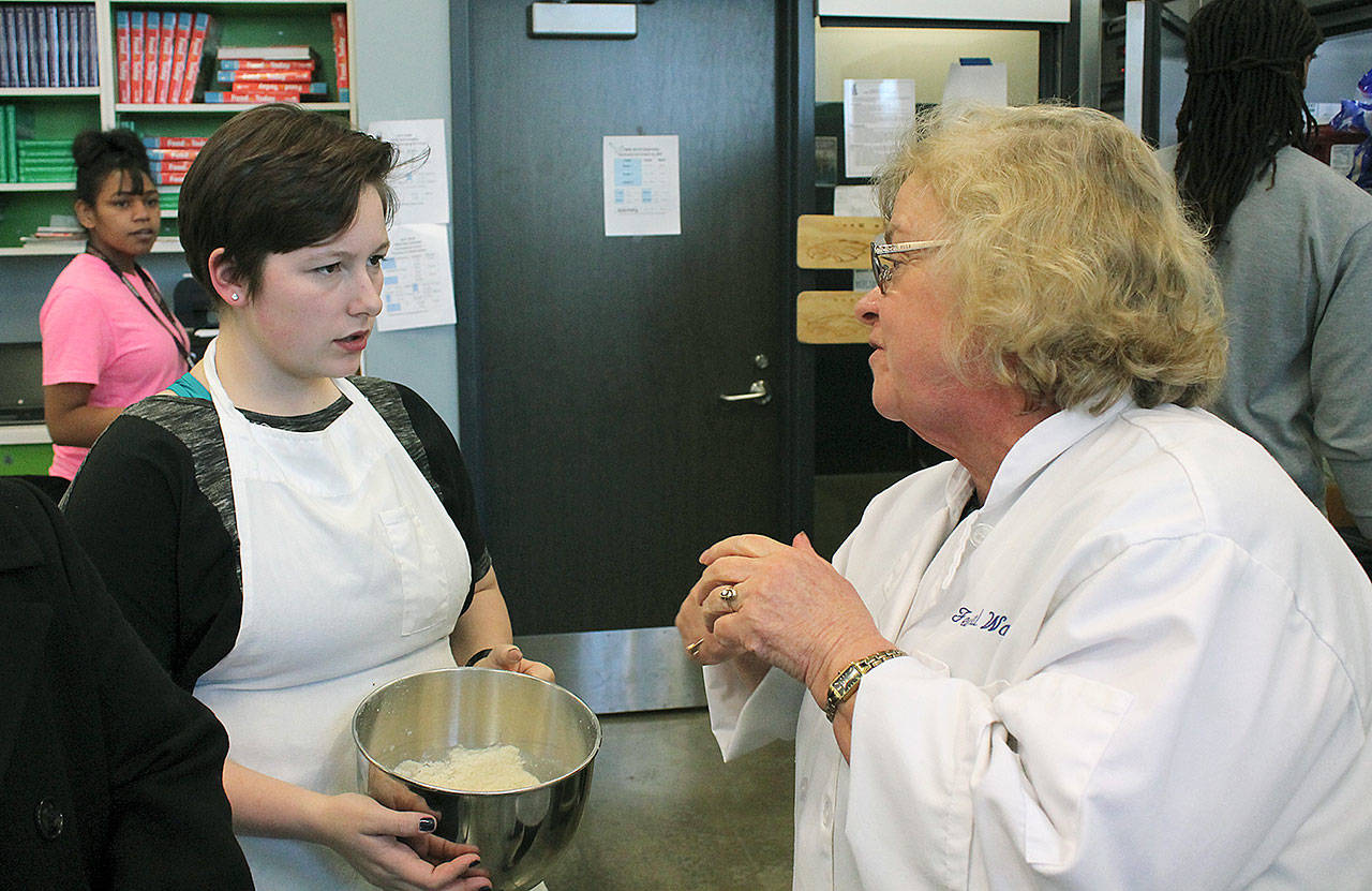 Federal Way High School junior Connor McConnaughey speaks to Foundation of Culinary Arts teacher Sherry Kerr about a holiday recipe students were making in class before winter break. McConnaughey wants to pursue a career as a pastry chef and intends to take Kerr’s ProStart Culinary Arts Program class, which is a career and technical education program offered at Federal Way and Thomas Jefferson high schools. JESSICA KELLER, the Mirror