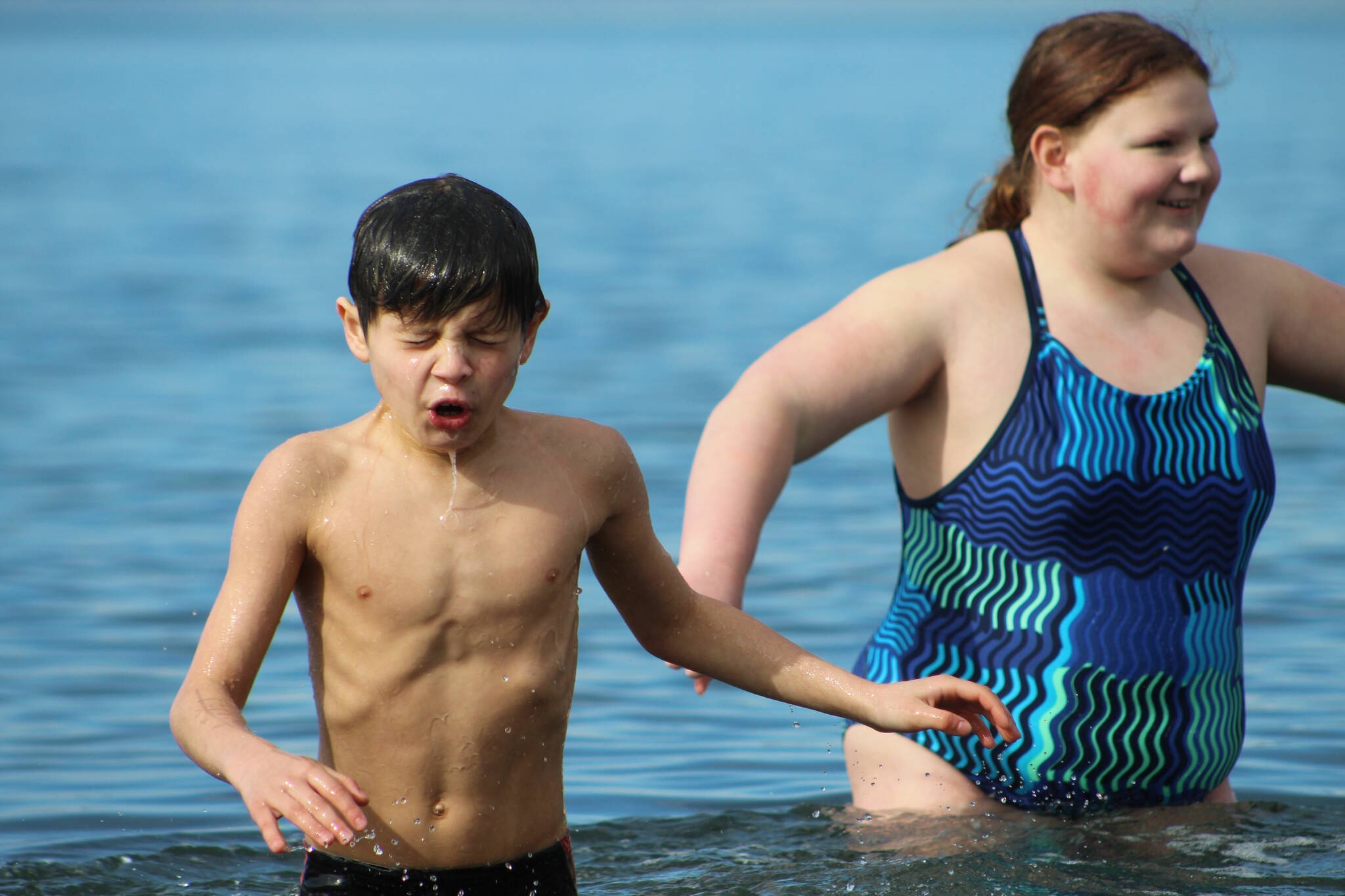 Shivering, laughing and gasping for air, they yelped or held hands to stomach the cold beach tides next to Salty’s Restaurant. A few of the kids stayed in for several minutes, testing how long they could brave the cold. The adults left in shorter order.
