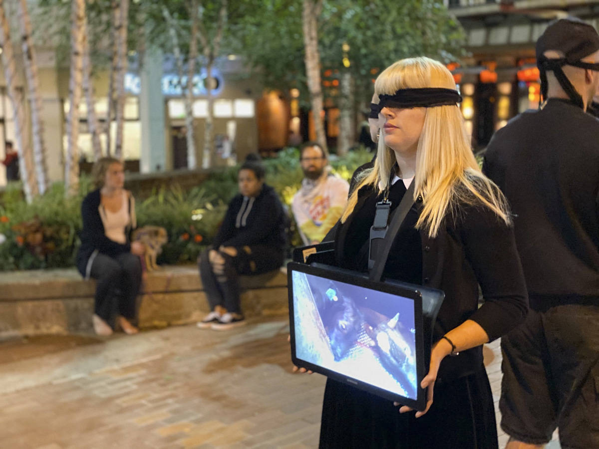 During the demonstrations, the activists typically form a cube, silently standing back to back during the Bellevue events, wearing blindfolds and holding video screens showing standard animal agriculture practices.