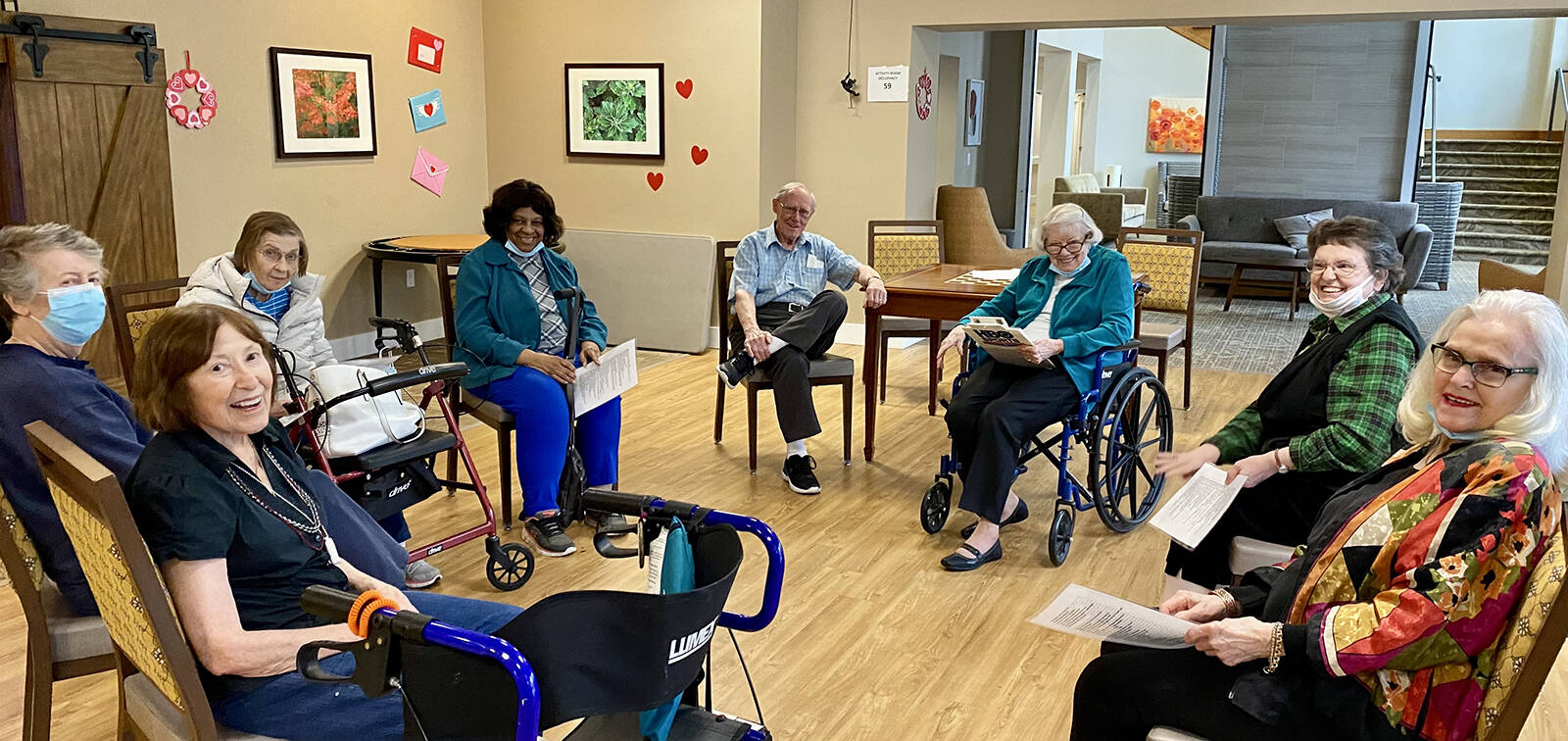 “I love all of the group activities because I get to talk to people—and I love people!” notes Karen R., “I can’t choose just one activity!” Lisa J. plays piano for the weekly happy hour sometimes, and she says that “I love music, especially the singalongs. Sometimes we go on YouTube and sing along as a group.”