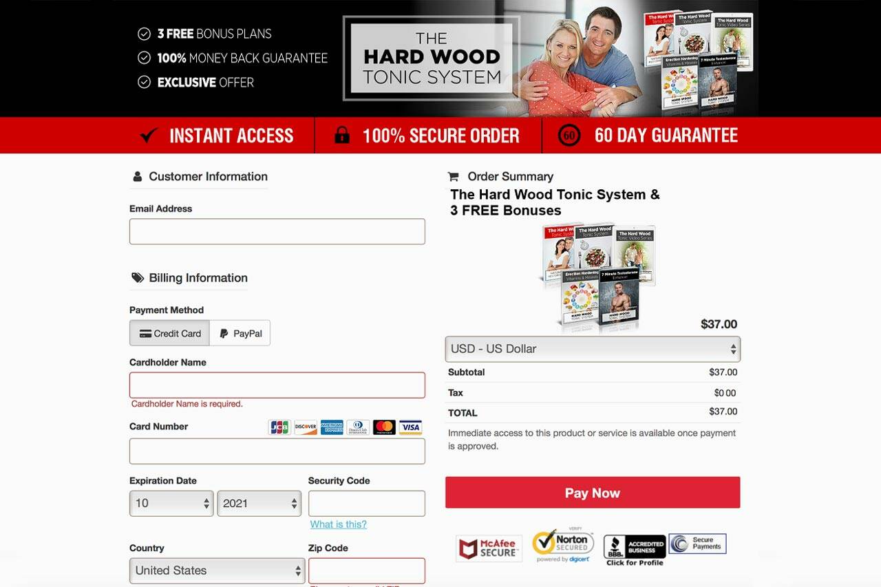 If you want to get rid of your erectile dysfunction problem for good, the Hard Wood Tonic system is here for you at an affordable price. To get it, head to the official website, click ‘’Add To Cart,’’ and you will be redirected to a page where you will be required to fill in your details. Confirm your order, and you will be allowed to access the Hard Wood Tonic System, which will provide you with all the benefits you have been longing for.