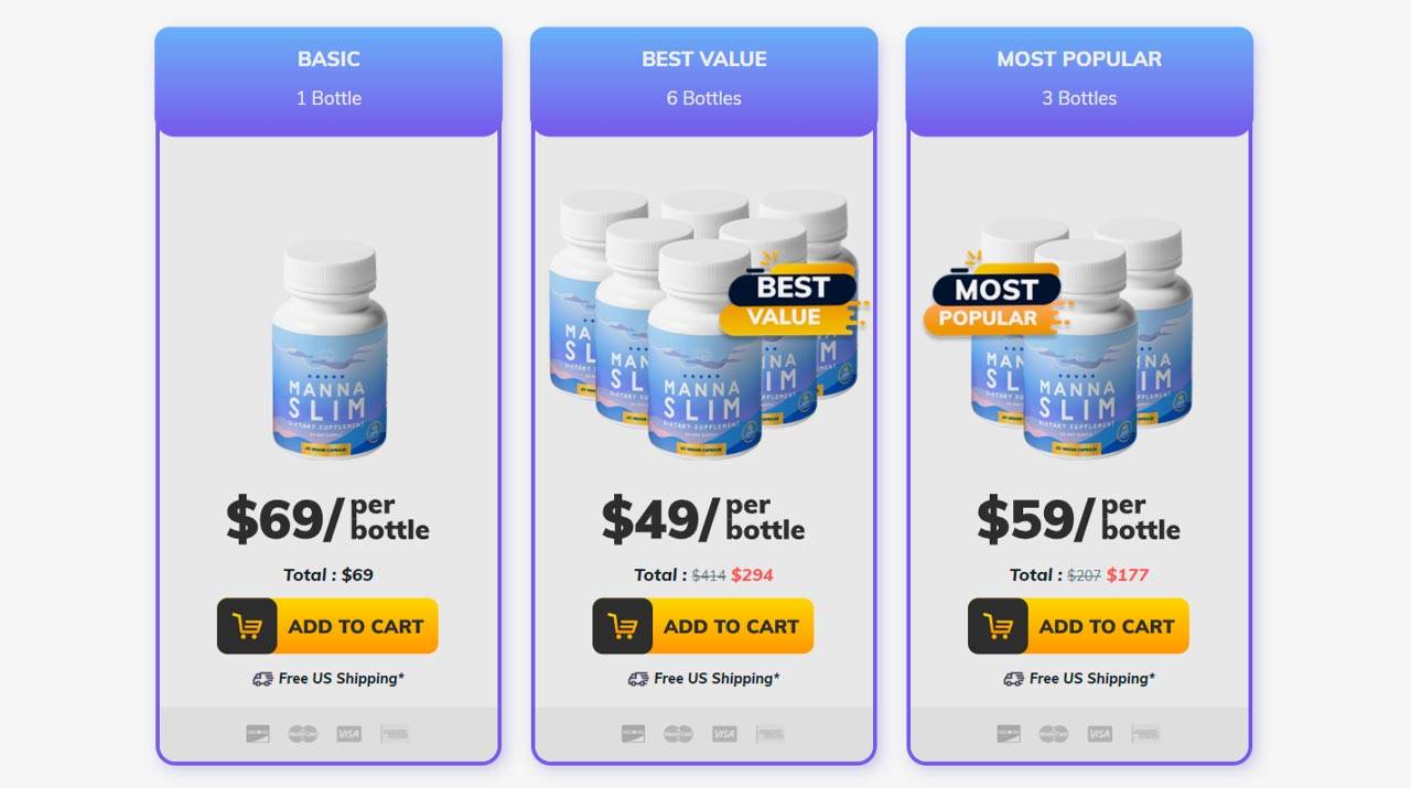 Buying in bulk allows consumers discounts. Such as, if you choose the three units option of Manna Slim, you pay only $177.00, or $59.00 for each bottle. However, if you want the best value, you may wish to buy at least six bottles, which will cost $294.00, at only $49.00 per bottle. One bottle Of MannaSlim cost is $69.00 per bottle.