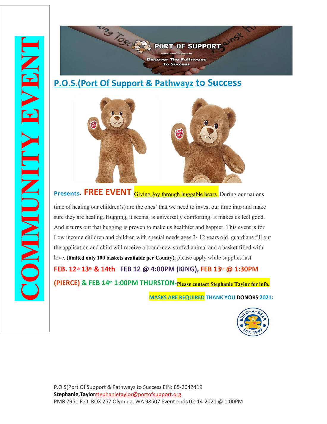 So this March P.O.S. is delivering hundreds of huggable bears and toys to low income children and children with special needs ages three to 12, living in King, Thurston and Pierce County.