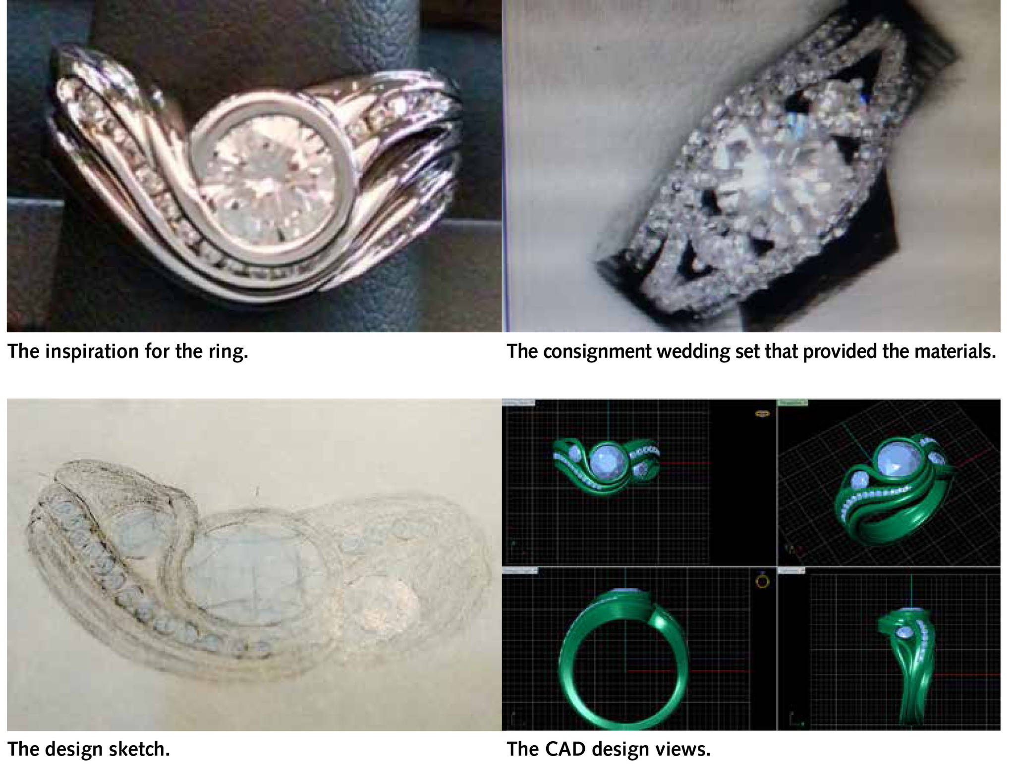 More affordable than expected: By using a consignment wedding set from the store, the Hightowers saved one-third to one-half of the cost of creating the ring from new materials, she says. “I already had a design in mind and we visited a few times until we found the perfect set to work with. With John we were able to take an already beautiful piece of jewelry and re-create it into something new and meaningful to us.”
