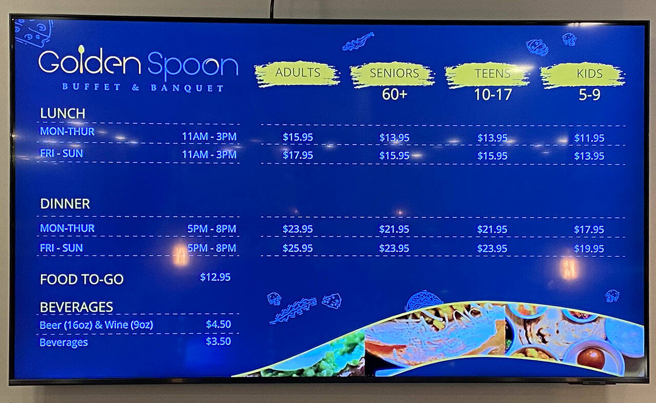 The Golden Spoon is ready to accommodate all taste palates. Diners can enjoy a rotating variety of soups, a fresh salad and vegetable bar, a dessert bar, and traditional comfort foods of meatloaf, mashed potatoes and gravy, fried chicken, carved meats and more.