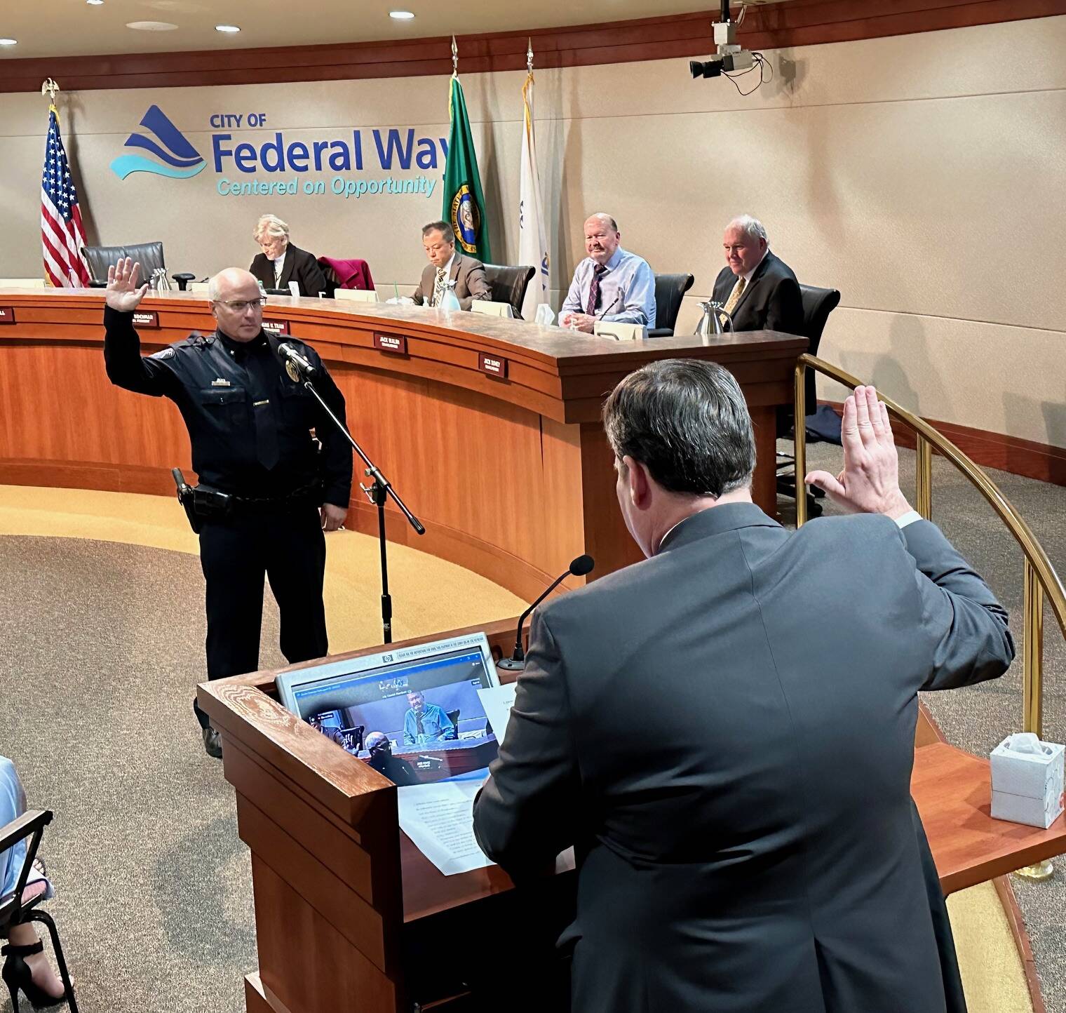 In other police department news, Lt. Bryan Klingele was promoted to commander and sworn in as such at the council meeting. Klingele has 29 years of law enforcement experience and was a founding member of the Federal Way Police Department. He was also in the United States Army and was award the Armed Forces Expeditionary Medal.