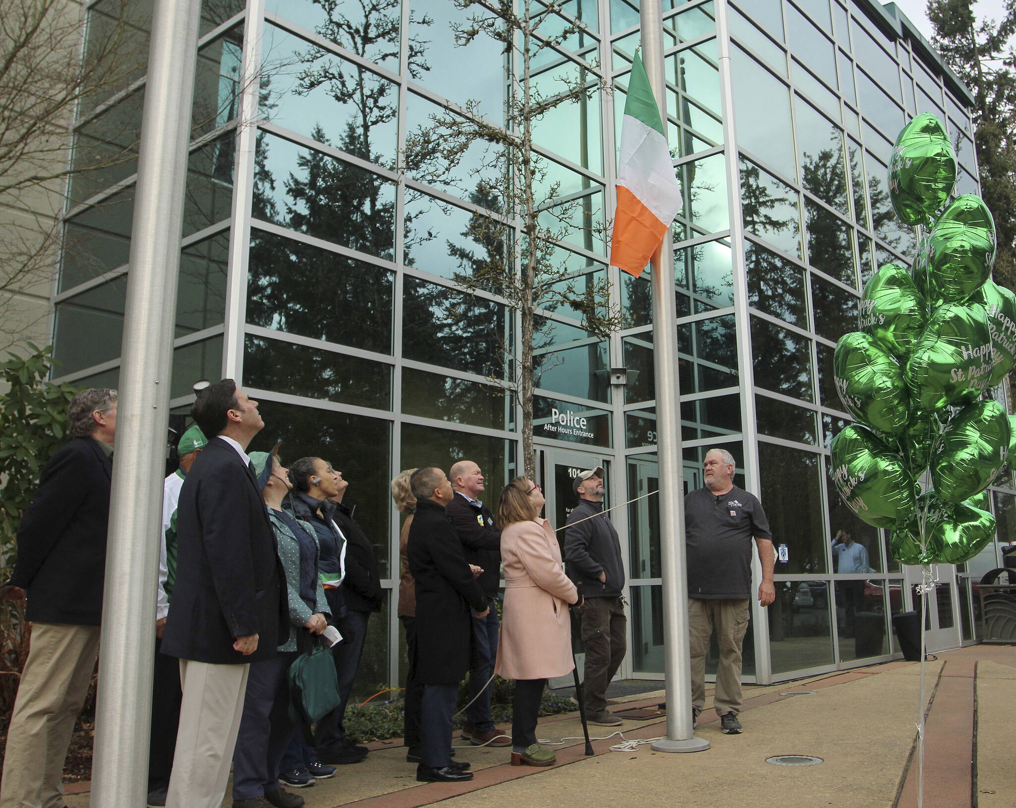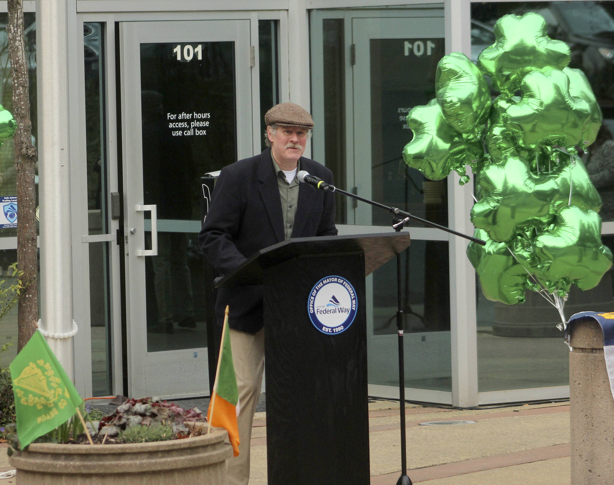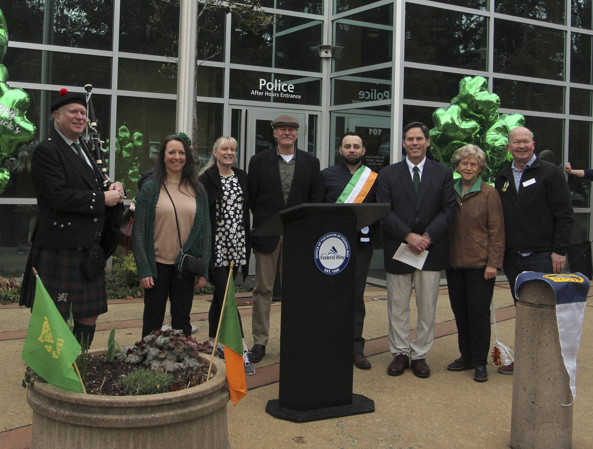 Mayor Jim Ferrell read a proclamation outside Federal Way City Hall declaring March 13-21 as Irish American Heritage Week, asking all residents to observe the week by celebrating the contributions of Irish Americans to the local community.
