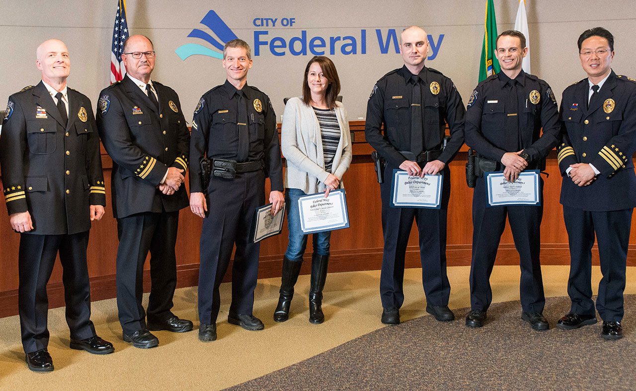 Federal Way Police Department Chief Andy Hwang and command staff recognized employees who exceeded expectations in the past year during the department’s Employee of the Year Awards ceremony Tuesday. The ceremony is an opportunity to allow members of the department to share its recognition with all department members and their families. This year’s winners are: