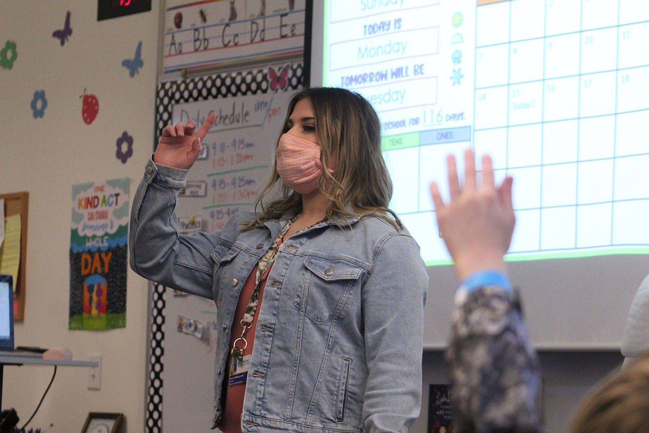 First grade teacher Alyssa Natsiopoulos asked her students to fill out a calendar entry “just like we did on Zoom,” she said from behind a light pink-colored mask.