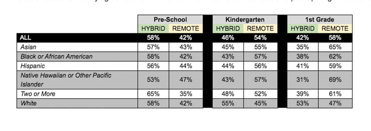 However, for kindergarten and first grade levels, Black, Asian, Hispanic and Native Hawaiian students have preferred to remain in remote learning.
